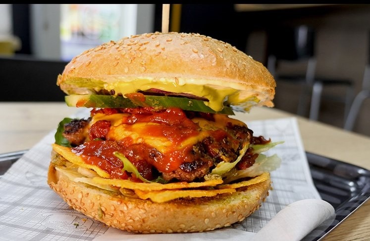 wołowina, podwójny ser, sałata, ogórek, pomidor, cebula, sos serowy, nachosy.