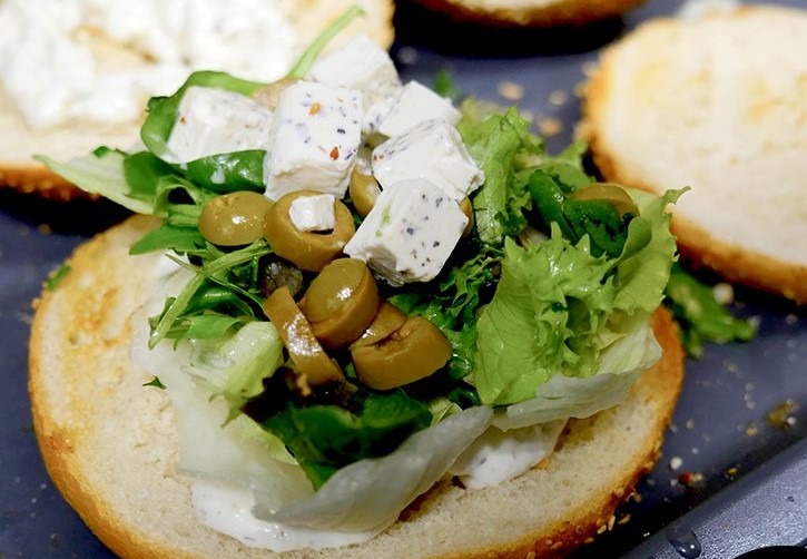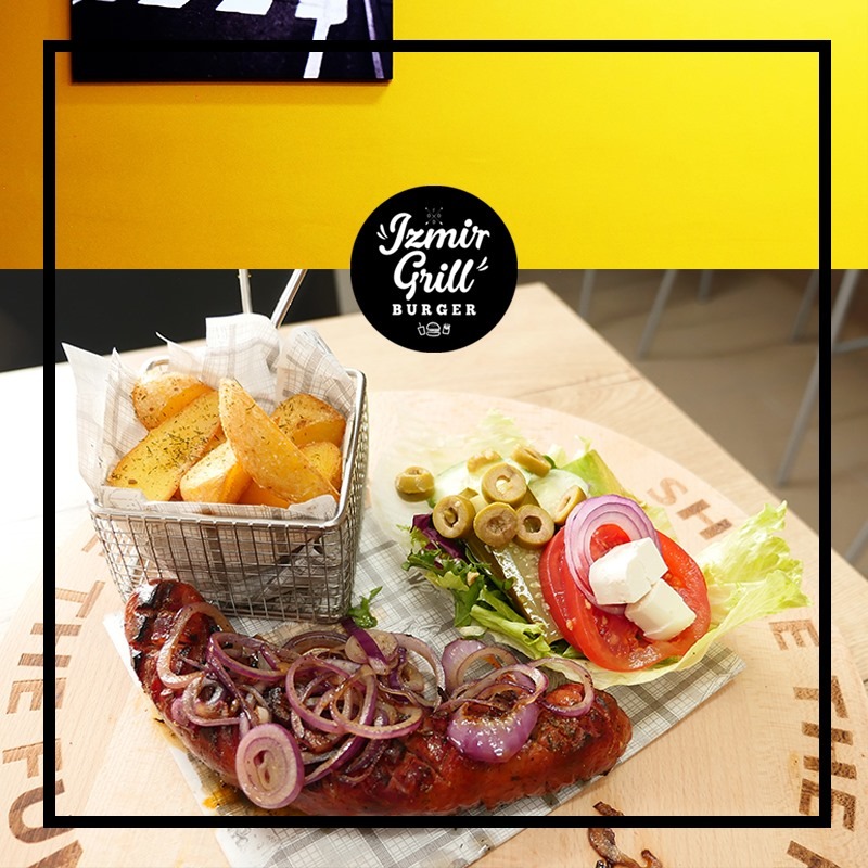 wołowina, ser feta, ser cheddar, pomidor, ogórek, oliwki, cebula, sałata, sos czosnkowy.