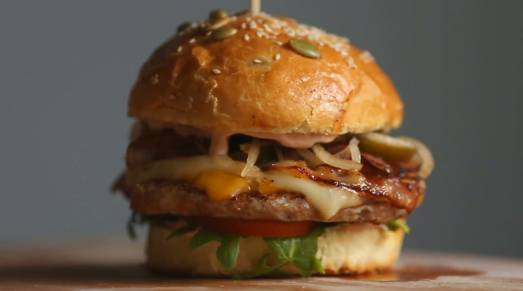 ser, podwójny bekon, pomidor, ogórek konserwowy, sałata, cebula, sos serowy, BBQ, majonez.