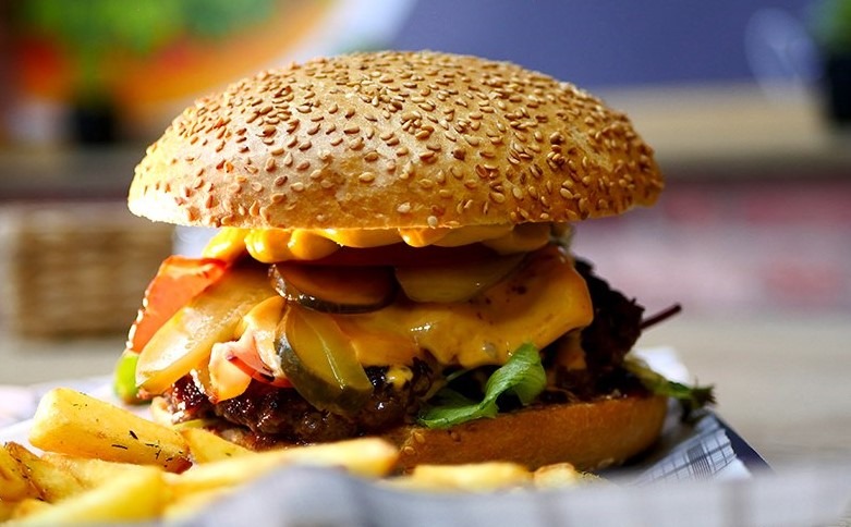 wołowina, sałata, ser, pomidor, ogórek konserwowy, cebula, majonez, musztarda.