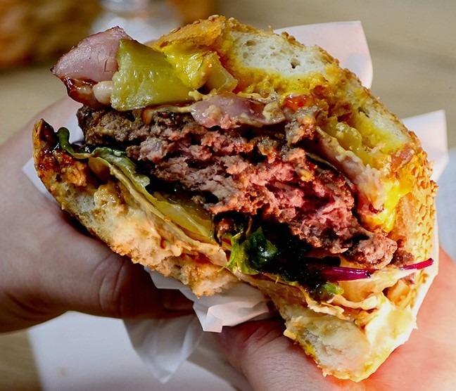 wołowina, papryczki jalapeno, ser, pomidor, ogórek kiszony, sałata, cebula, sos ostry, majonez, BBQ.